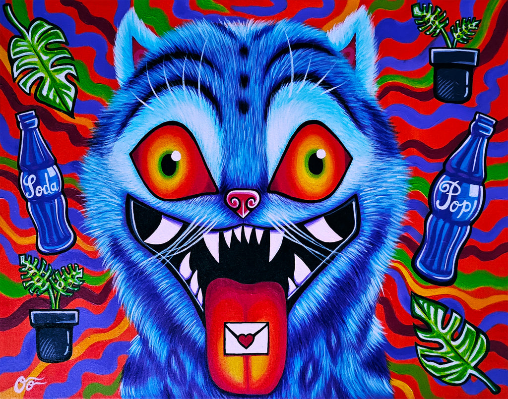 With vibrant neon hues, cheeky details (yes, he’s got a love letter on his tongue 💌), and a retro soda-pop vibe, this piece is perfect for fans of bold art, pop culture, and a splash of mischief.