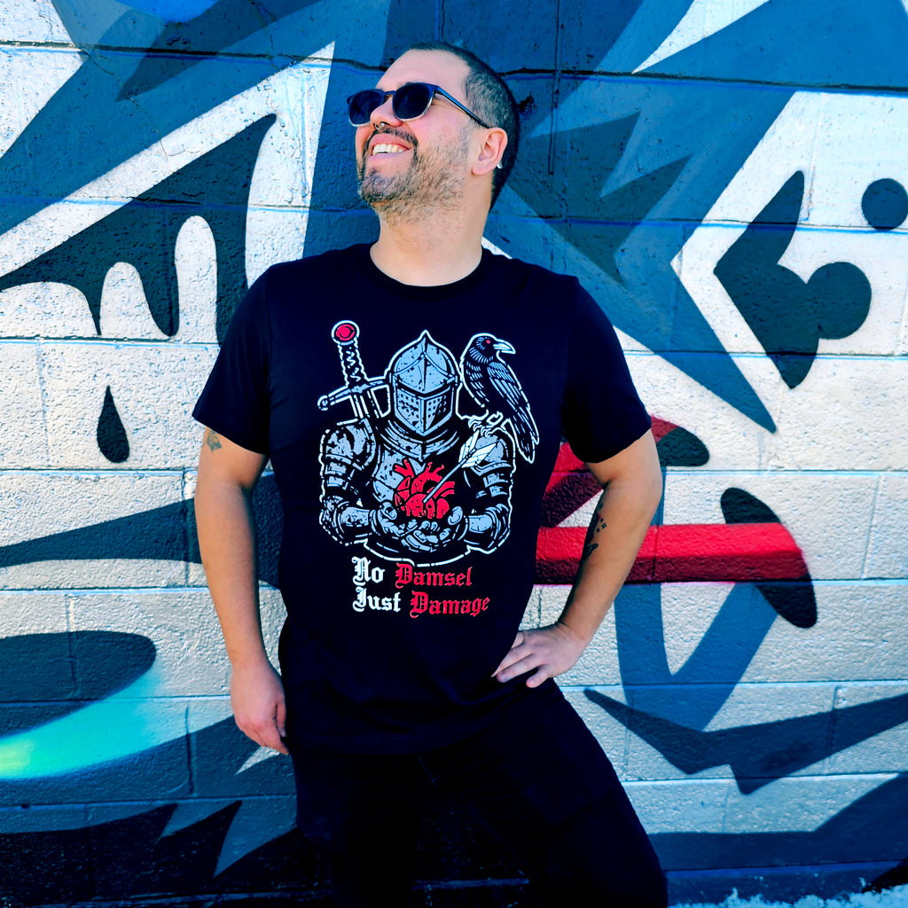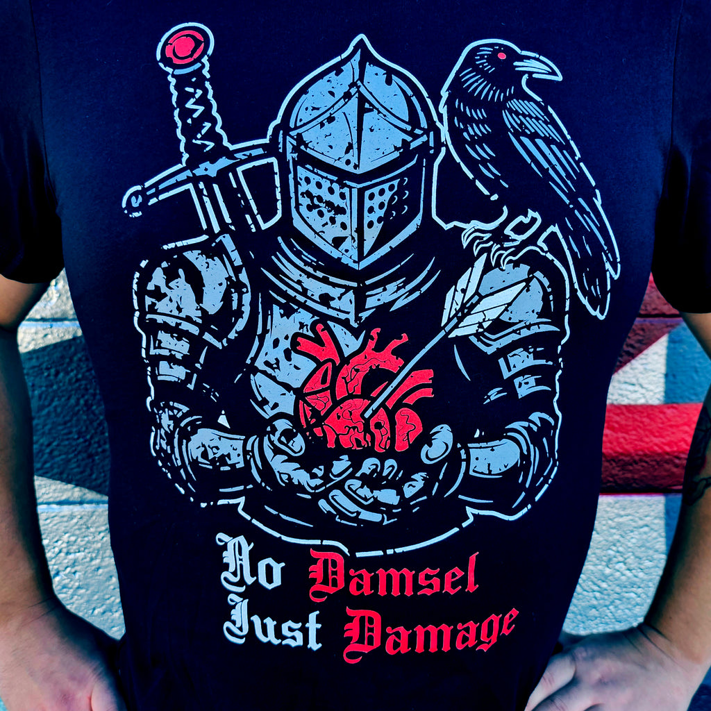 This design features a battle-worn knight holding a freshly claimed heart, a raven perched like a loyal witness, and gothic lettering that says exactly what it needs to: No Damsel. Just Damage.